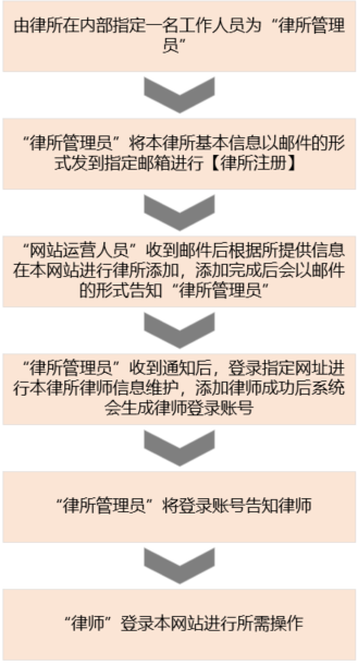 1、律师登录账户不是注册生成,是由律所管理员事先在本系统维护生成的,所以请先了解律师登录账号生成流程,如下图:
