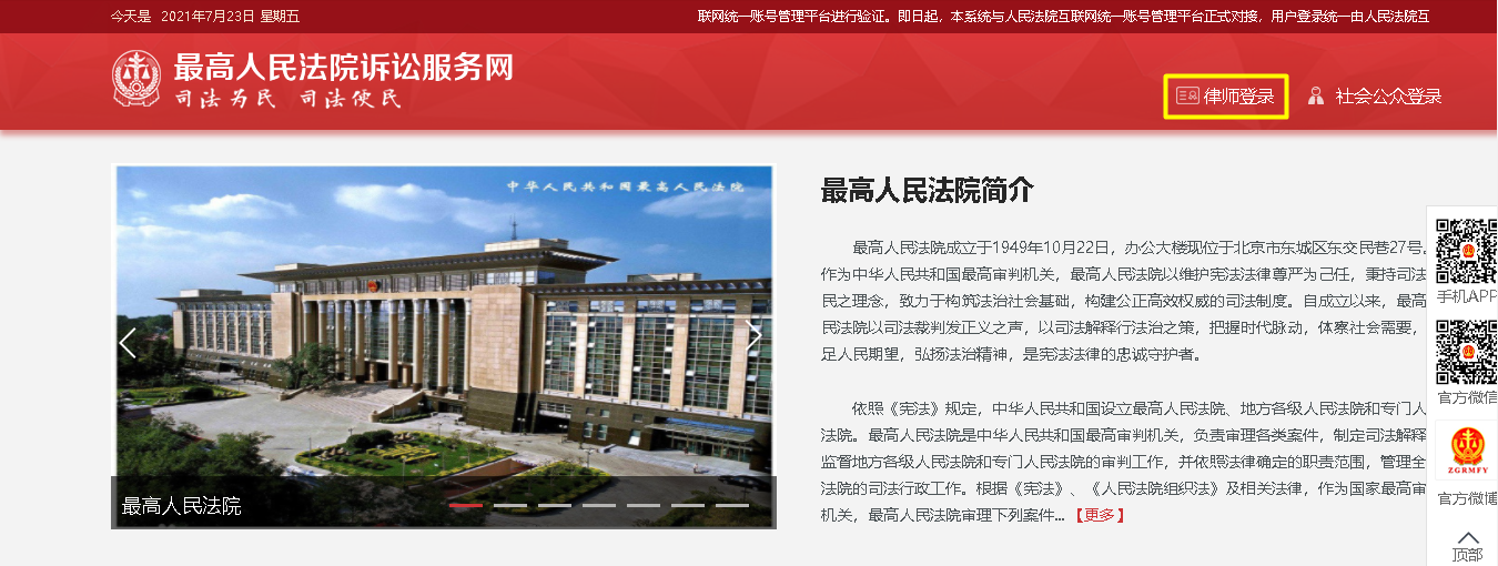 1) 最高人民法院律师服务平台已与人民法院互联网统一账号管理平台进行对接,2021年6月1日前登录过最高人民法院律师服务平台的律师,6月1日后分为两种情况登录: