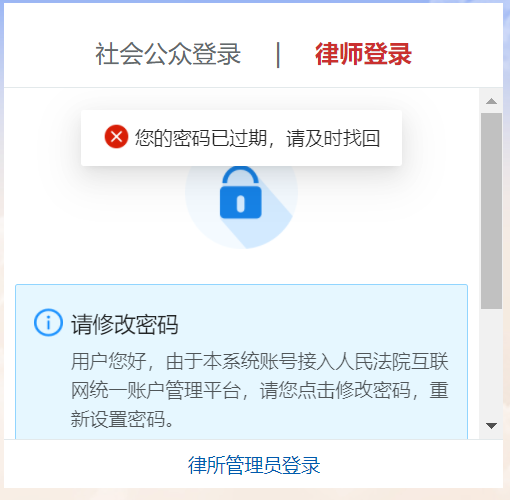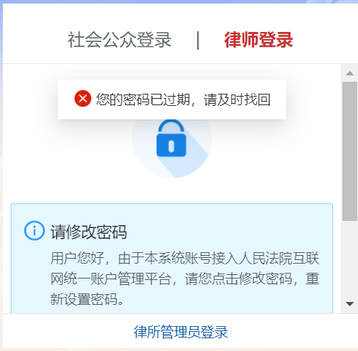 b、律师未注册过人民法院互联网统一账号管理平台对接的其他平台,重置密码后即可使用。相关提示如下: